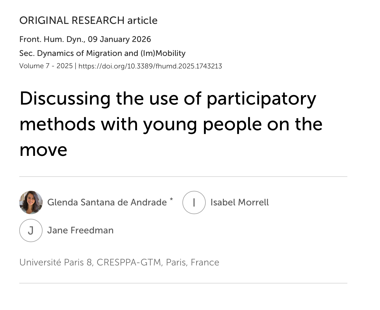 Authored by Glenda Santana de Andrade, Jane Freedman and Isabel Morrell, this open-access article has been published in Frontiers in Human Dynamics and reflects on the use of participatory methods with young people on the move.