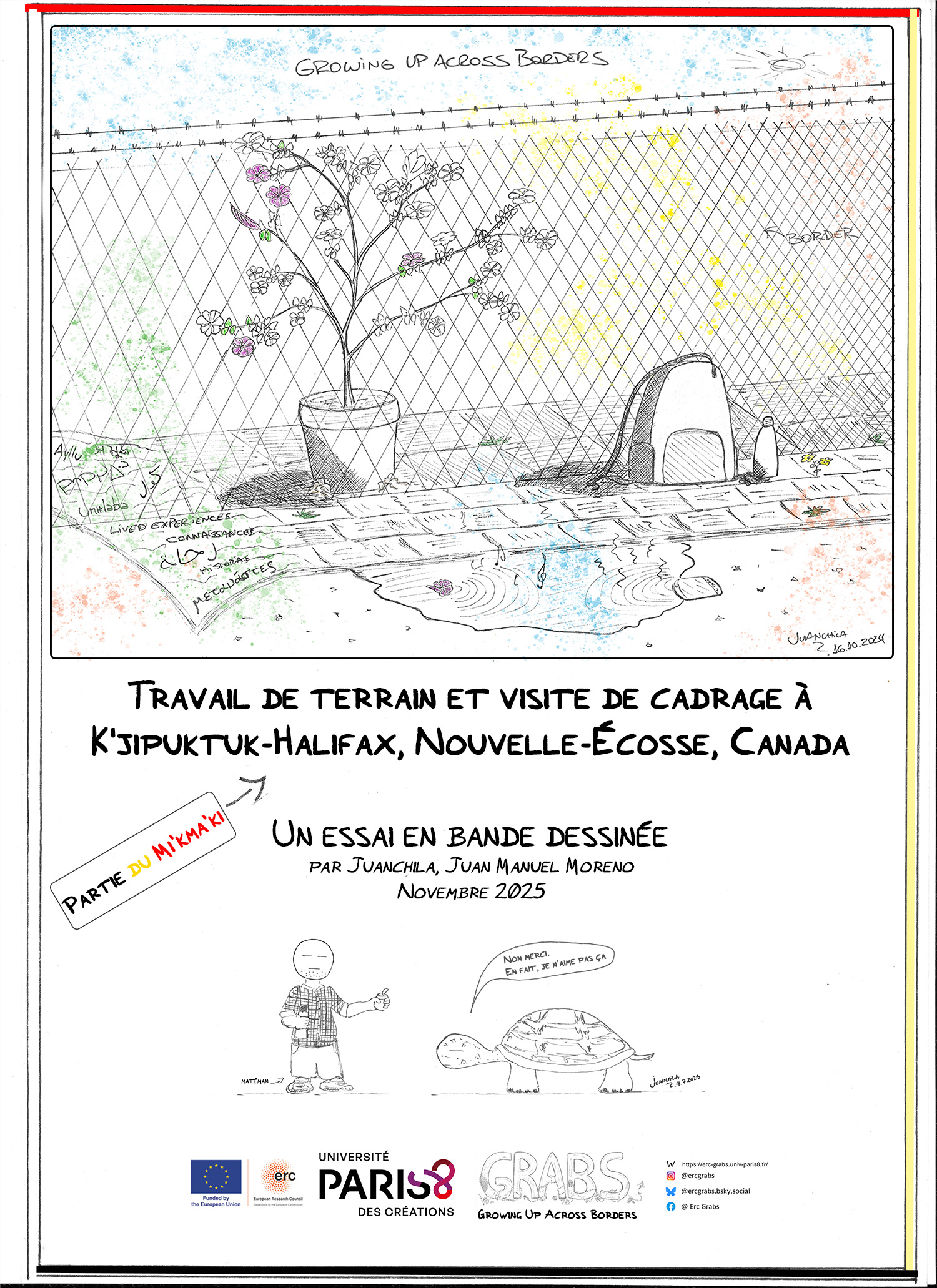 Cet essai en bande dessinée est à la fois un rapport et une exploration méthodologique réalisés lors de mon travail de terrain et visite exploratoire à K’jipuktuk-Halifax, en Nouvelle-Écosse, au Canada, entre le 18 juillet et le 4 août 2025.